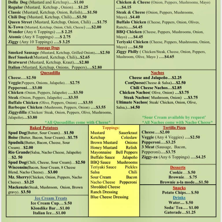 Ziggy Dogs offers a straightforward and approachable menu centered on classic American comfort foods with a casual vibe. You’ll find simple, satisfying options like all-beef hot dogs topped just the way you like, hearty bratwurst, and loaded baked potatoes, making it easy to grab a quick bite or enjoy a relaxed meal with friends or family.