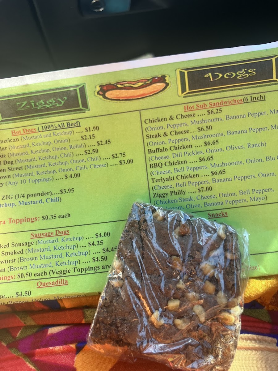 The menu highlights include flavorful choices such as the Chili Dog, Nachos with various toppings, and flavorful quesadillas — both chicken and veggie — providing a little variety beyond traditional hot dogs. Fresh baked cookies and brownies round out the experience with a familiar, homey touch.